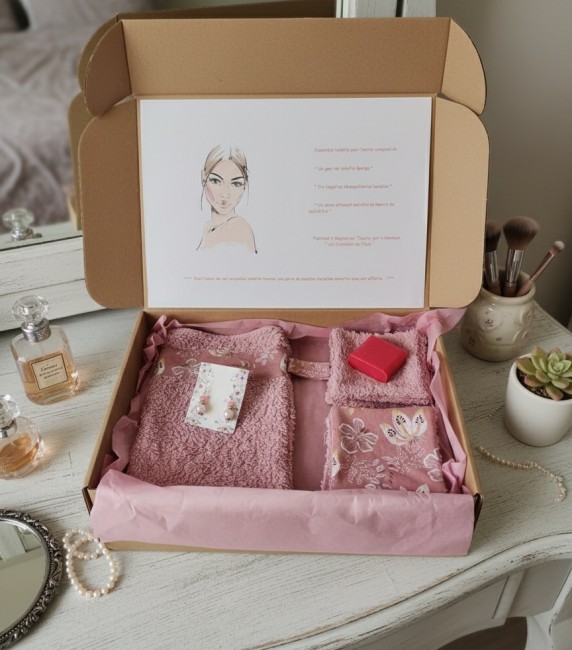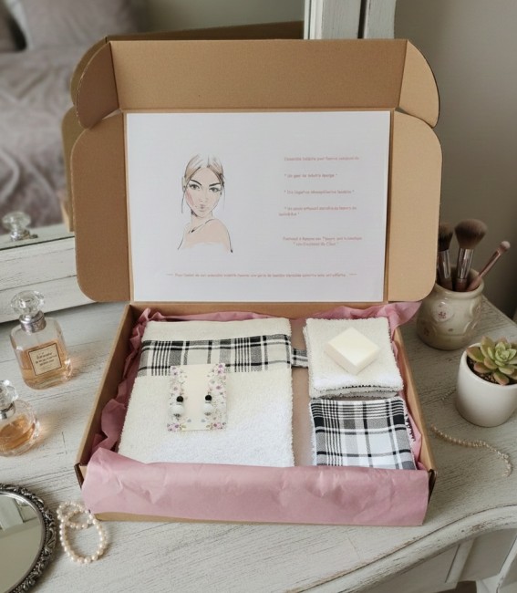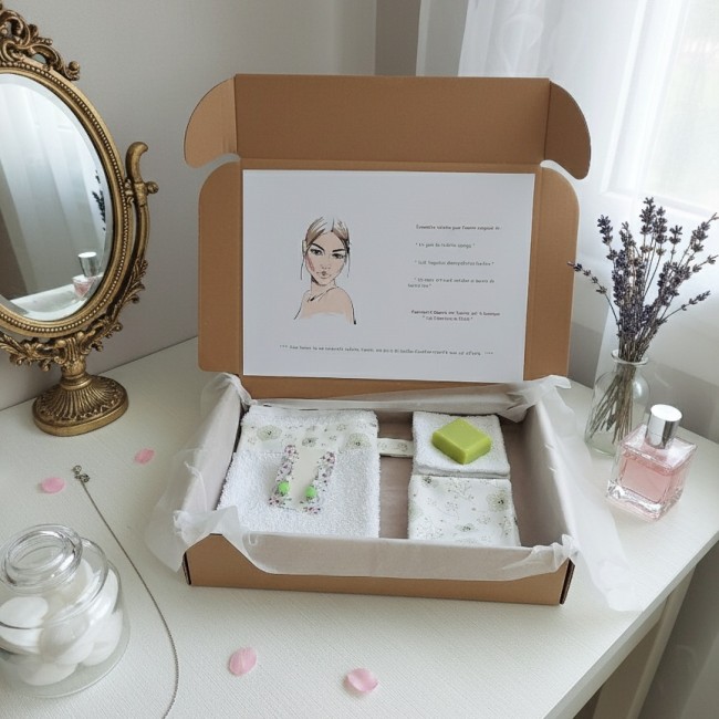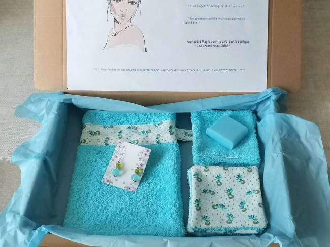 Cette box est composée d'un gant éponge, 8 lingettes démaquillantes en coton certifié Oeko-Tex et éponge et d'un savon de 30 g parfumé, fabriqué artisanalement en France et enrichis au beurre de karité bio. Pour l'achat de cette box, une paire de boucles d'oreilles aux couleurs assorties est offerte. Vendu avec sa boite en carton et emballé dans une feuille de papier de soie. Idéal cadeaux fête des mères et anniversaire.