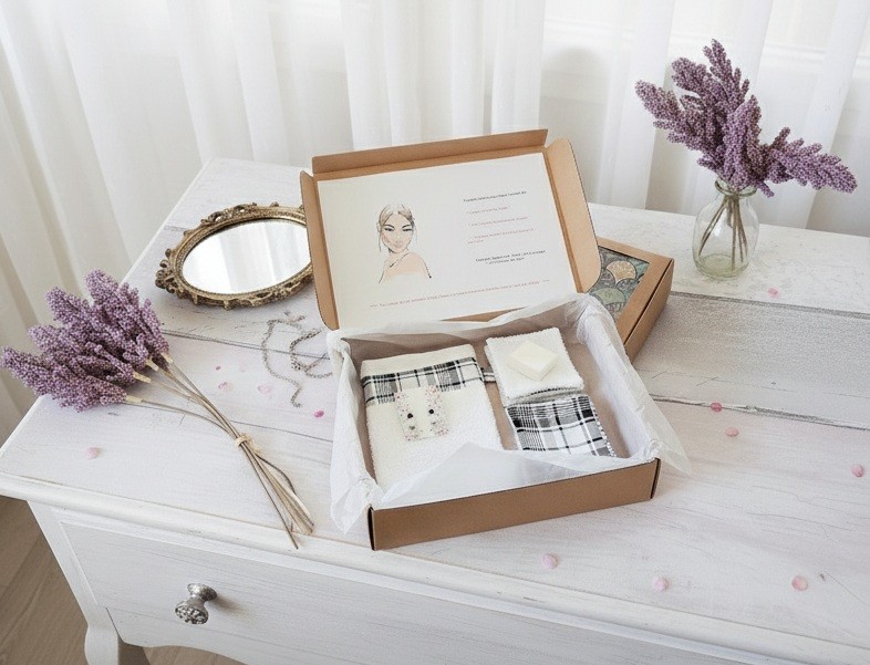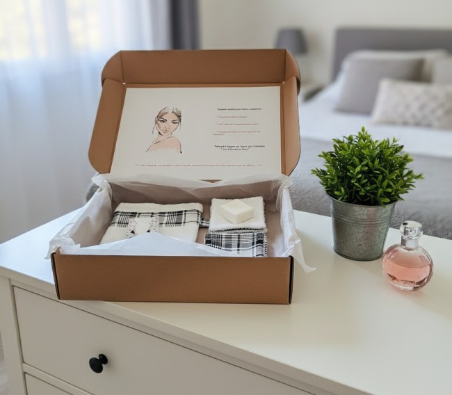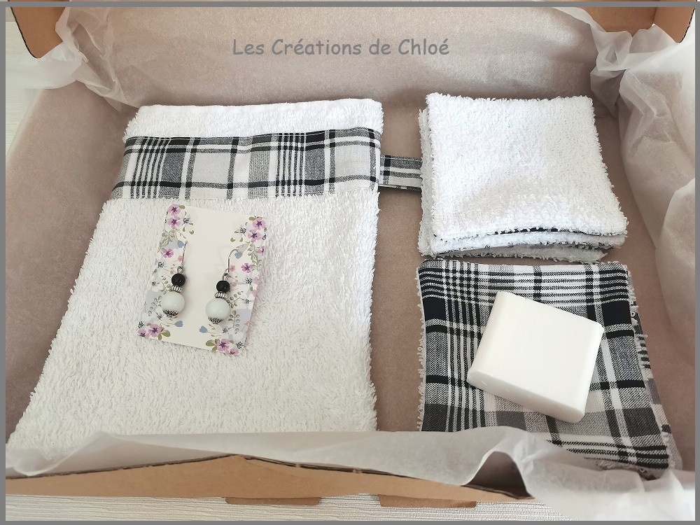 Cette box est composée d'un gant éponge, 8 lingettes démaquillantes en coton certifié Oeko-Tex et éponge et d'un savon de 30 g parfumé, fabriqué artisanalement en France et enrichis au beurre de karité bio. Pour l'achat de cette box, une paire de boucles d'oreilles aux couleurs assorties est offerte. Vendu avec sa boite en carton et emballé dans une feuille de papier de soie. Idéal cadeaux fête des mères et anniversaire.
