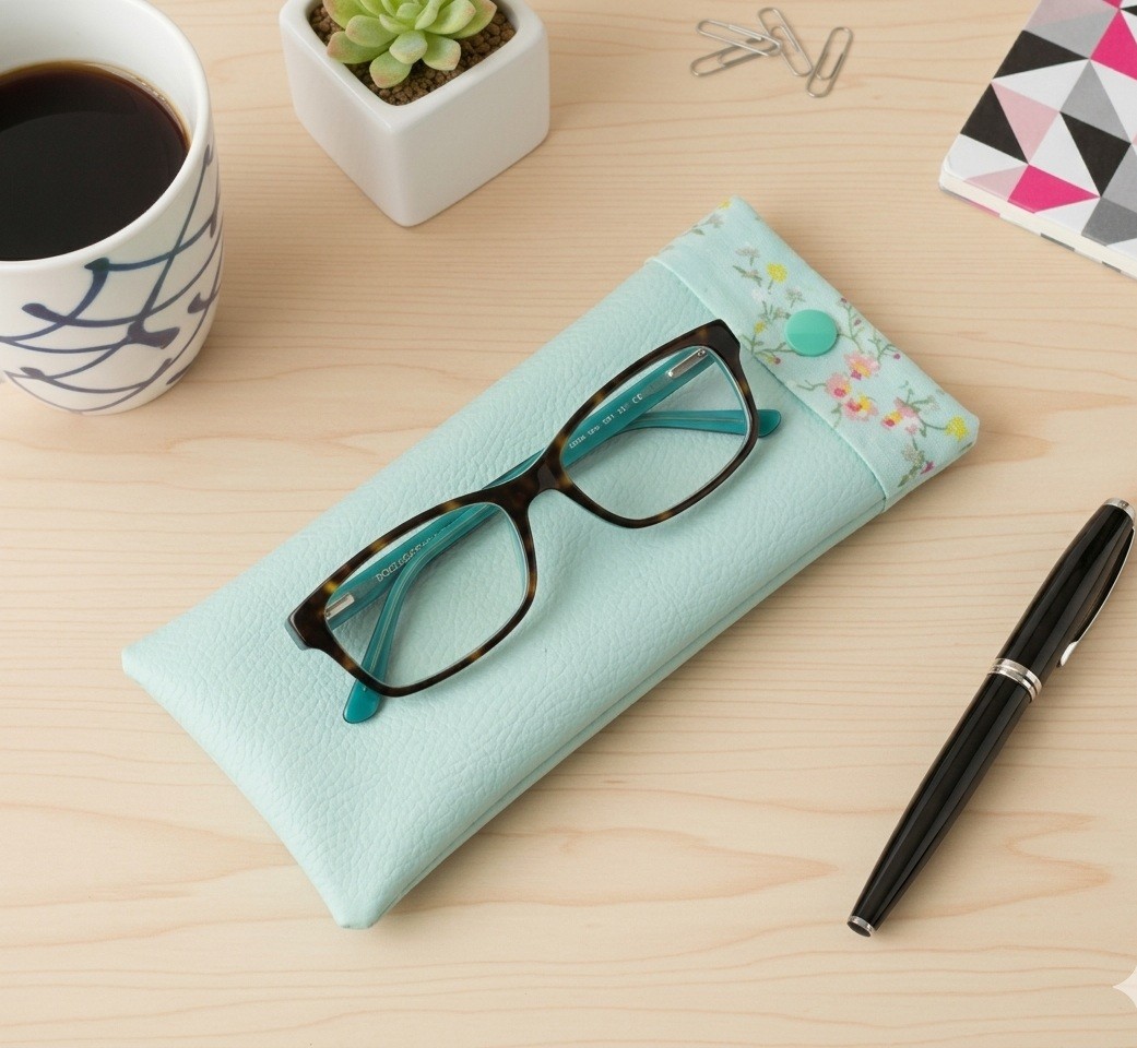 Étui pour lunette simili cuir vert d'eau et doublé en tissus coton certifié Oeko-Tex à motifs fleurs