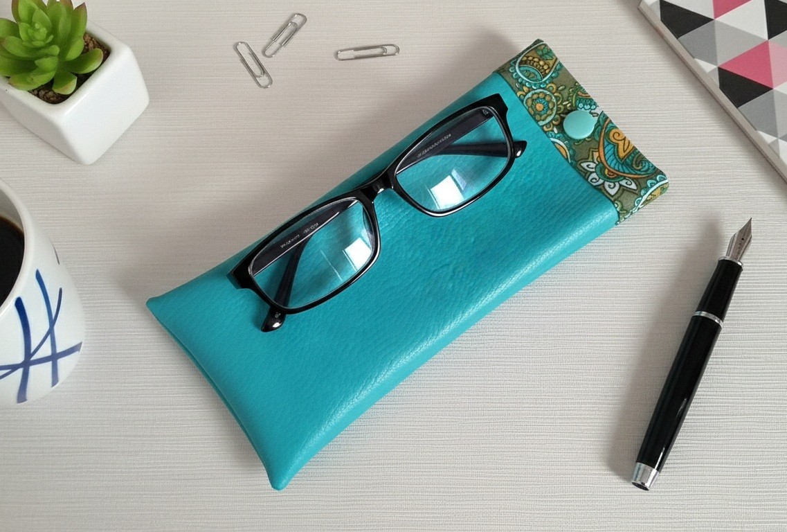 Étui pour lunette simili cuir bleu turquoise et doublé en tissus coton certifié Oeko-Tex imprimé cachemire
