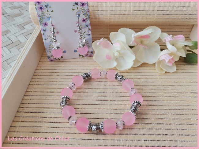 Kit parure bracelet et boucles d'oreilles perles en verre givrée rose