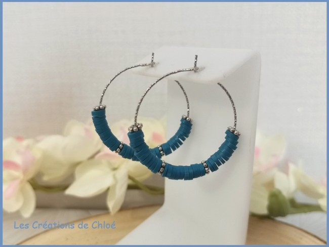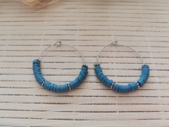 Kit boucles créoles acier inoxydable ciselé et perles Heishi bleu Jean