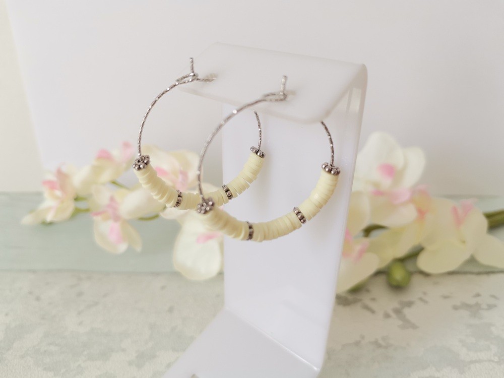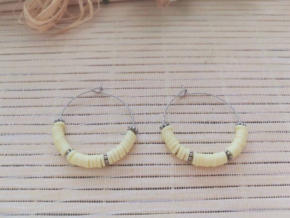 Kit boucles créoles acier inoxydable ciselé et perles Heishi jaune pale