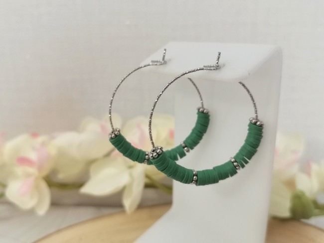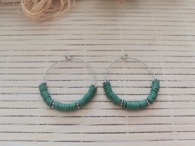 Kit boucles créoles acier inoxydable ciselé et perles Heishi vert foncé