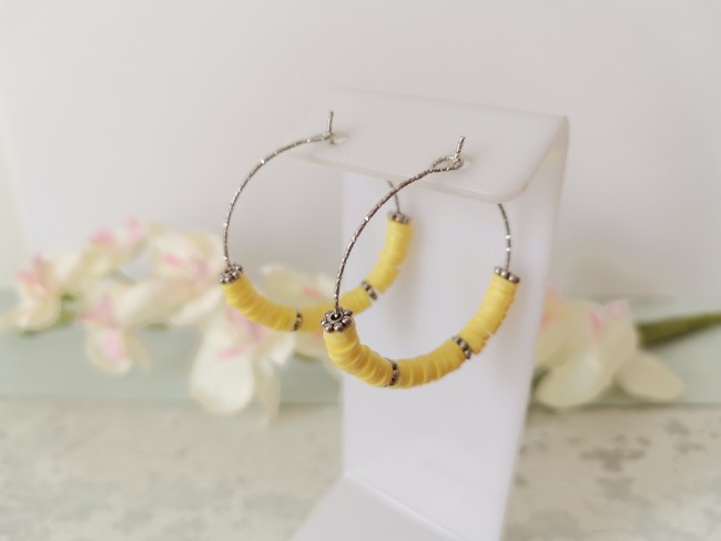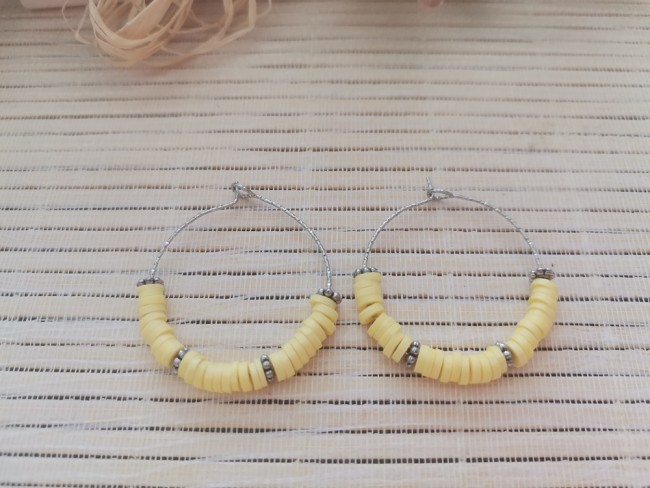 Kit boucles créoles acier inoxydable ciselé et perles Heishi jaune