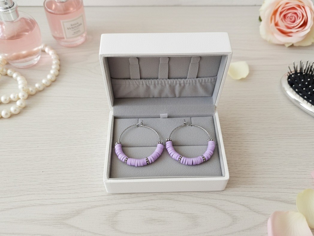 Kit boucles créoles acier inoxydable ciselé et perles Heishi lilas