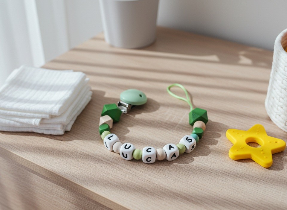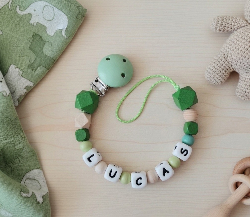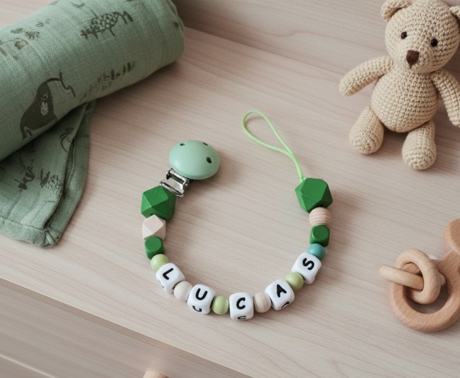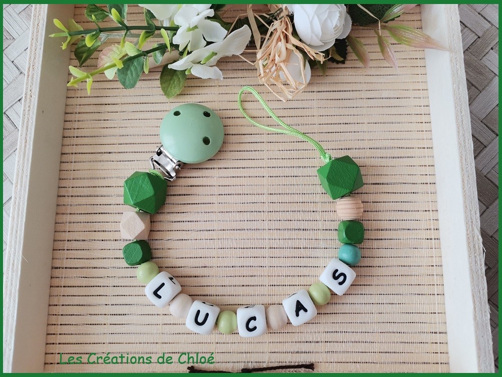 Attache tétine personnalisée perles bois et silicone blanc et vert