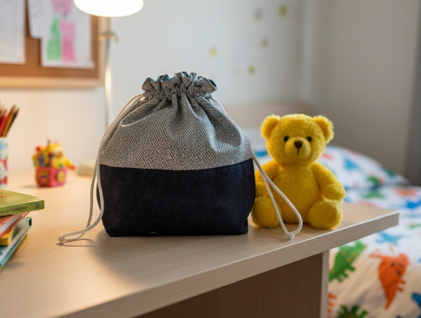 Joli petit sac pochon doublé, fait mains en tissu coton bleu marine et motif géométrique certifié Oeko-Tex. Se ferme par un cordon nylon coulissant de couleur blanche
