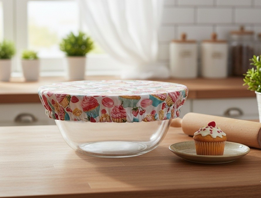 Charlotte alimentaire/couvre plat réalisé avec du tissu coton certifié Oeko-Tex motif gateaux sur fond blanc et doublé en tissu PUL, spécialement conçu pour un contact alimentaire sans transfert de substances nocives. Le PUL est également imperméable, préservant ainsi la fraîcheur de vos préparations.