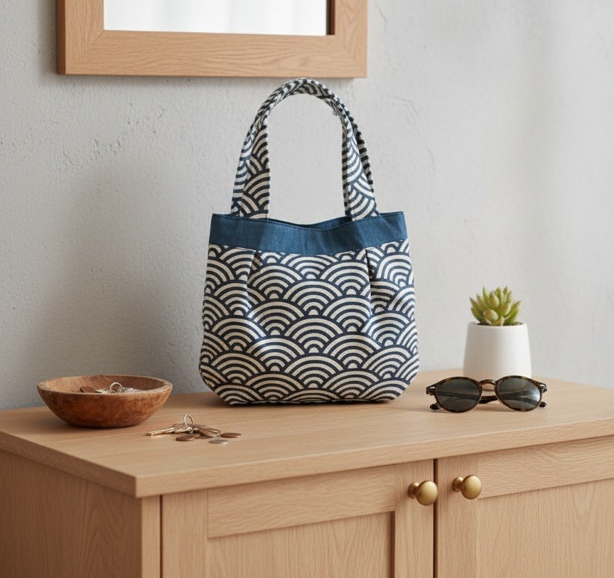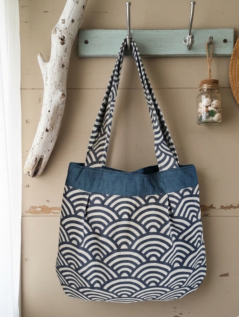 Ce sac très tendance est confectionné avec un mélange de tissu en coton épais de couleur bleu, de jean et doublé d'un tissu uni bleu