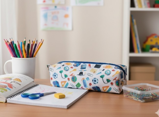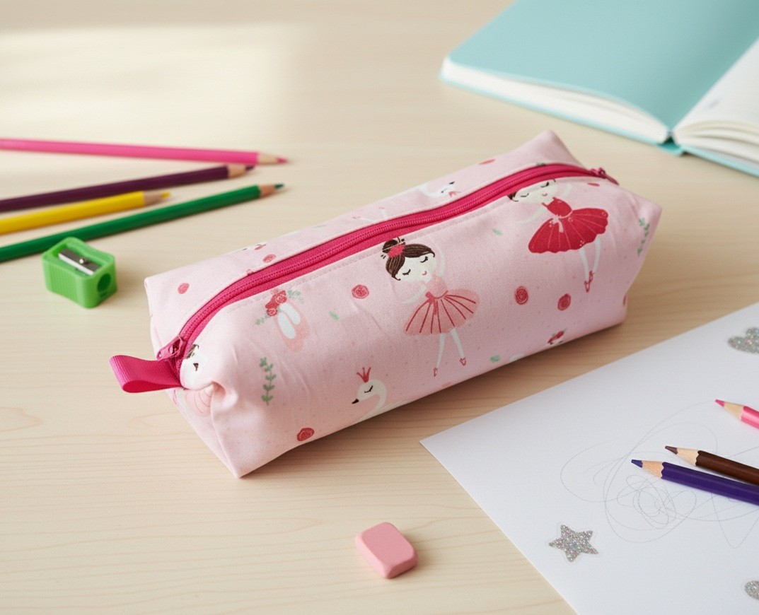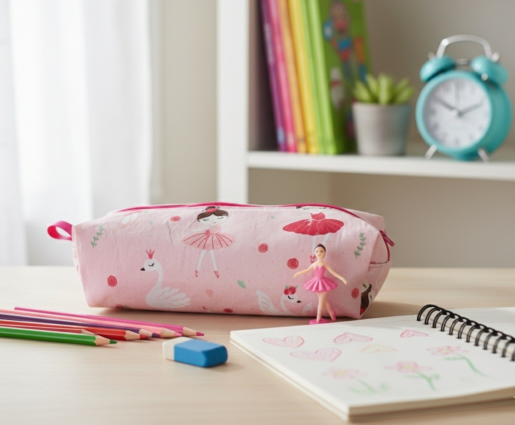 Trousse zippée en coton certifié Oeko-Tex motif danseuses sur fond couleur rose intérieur doublé d'un tissu polyester de couleur rose à fleurs blanches - Entoilage de renfort pour le tissu principal - Fermeture zippée de couleur fuchsia avec petite dragonne