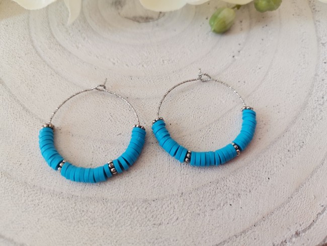 Kit boucles créoles acier inoxydable ciselé et perles Heishi bleu