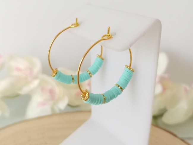 Kit boucles créoles acier inoxydable dorées et perles Heishi vert d'eau