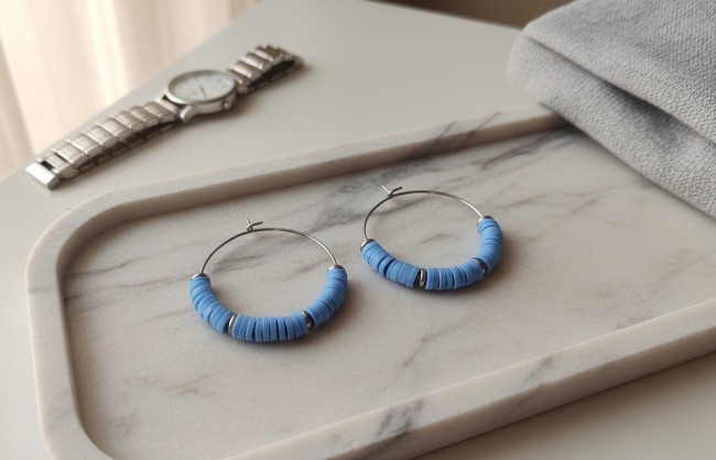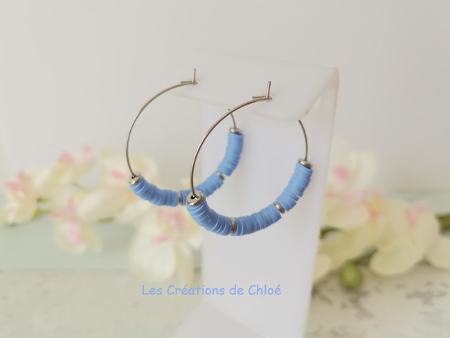 Boucles créoles acier inoxydable 30 mm et perles Heishi bleu azur