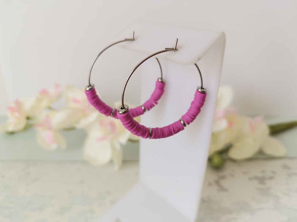 Boucles créoles acier inoxydable 30 mm et perles Heishi violet prune