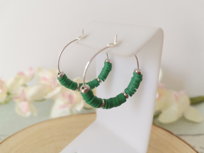 Kit de boucles d'oreilles créoles argentée 25 mm et perles Heishi vert foncé