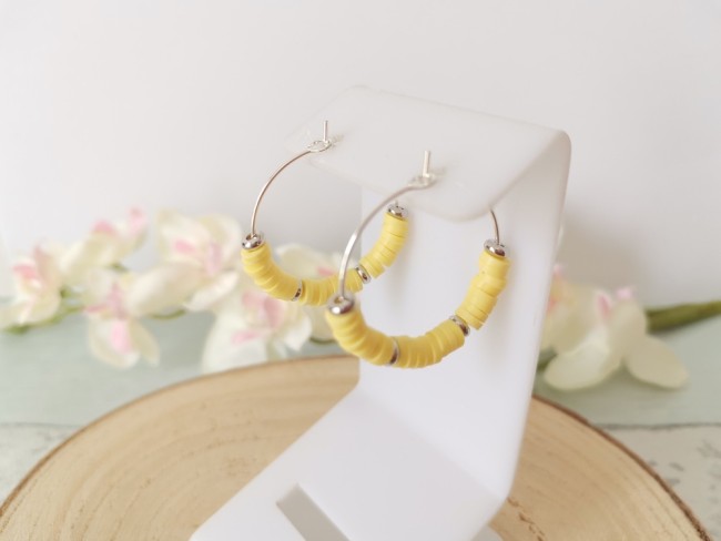 Kit de boucles d'oreilles créoles argentée 25 mm et perles Heishi jaune pale