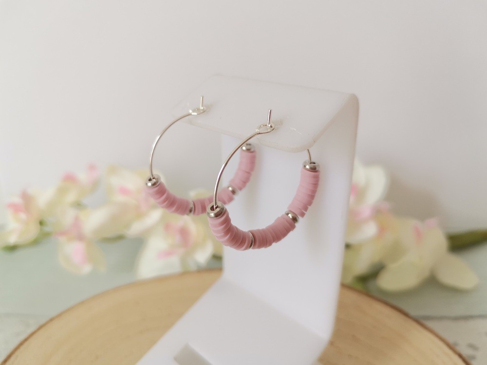 Kit de boucles d'oreilles créoles argentée 25 mm et perles Heishi vieux rose
