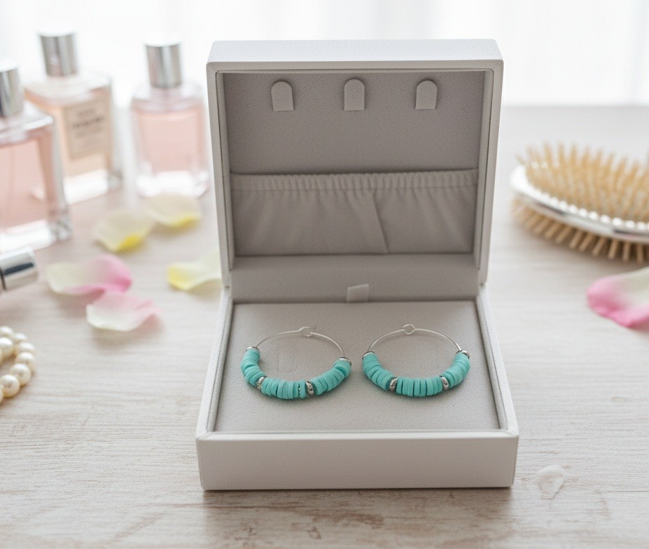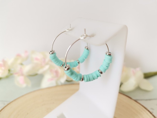 Kit de boucles d'oreilles créoles argentée 25 mm et perles Heishi bleu vert