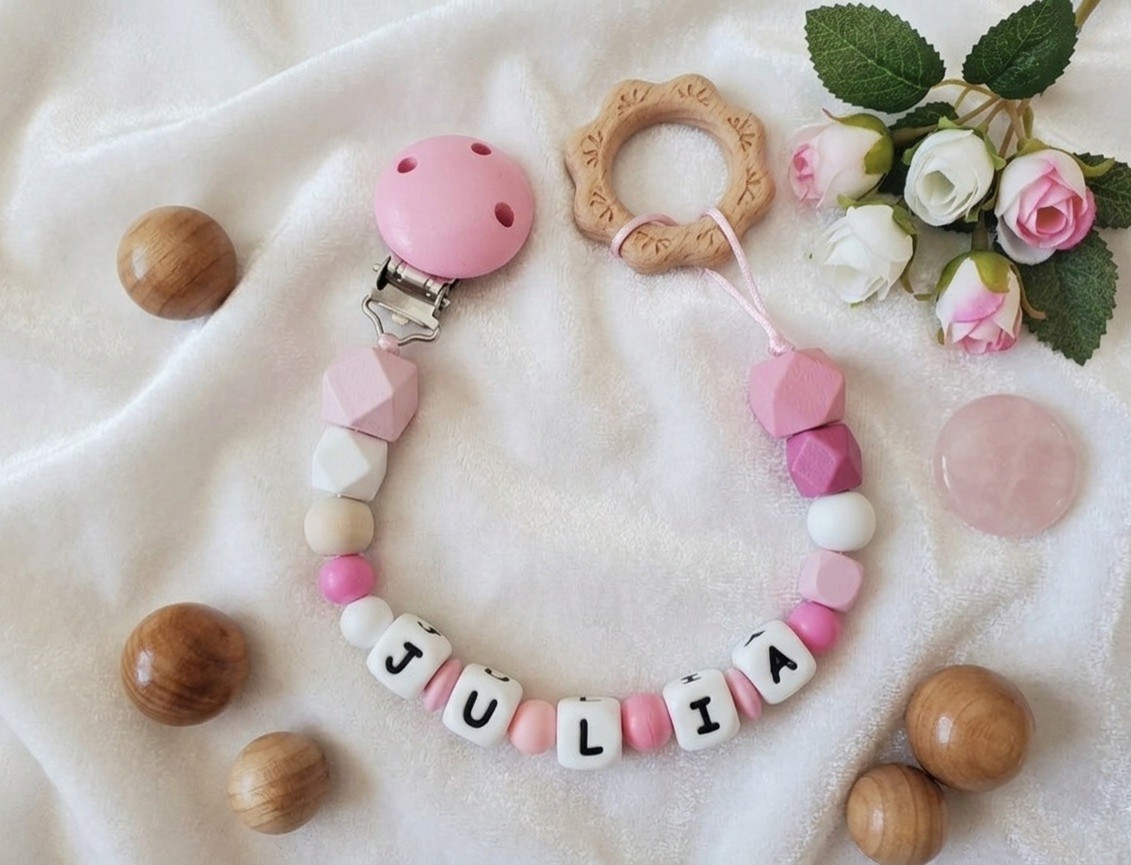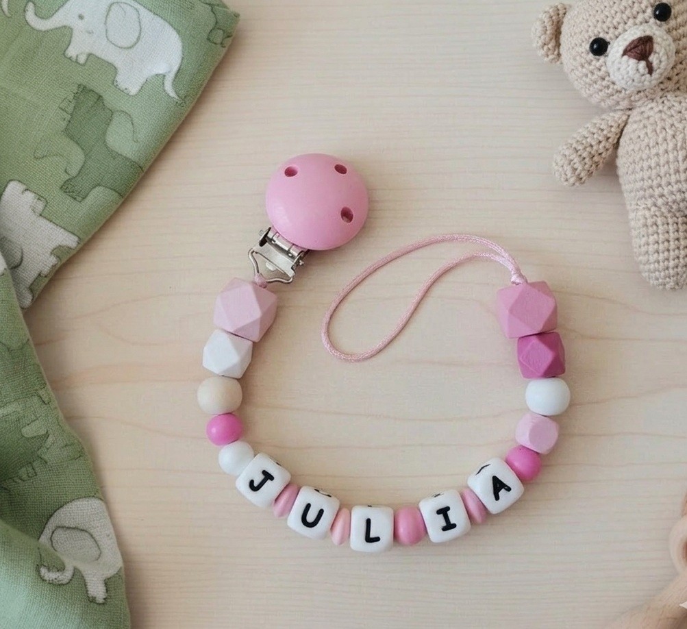 Cette attache tétine personnalisée est fabriquée avec des perles en bois de différentes tailles, formes et couleurs, et des perles alphabet en silicone.