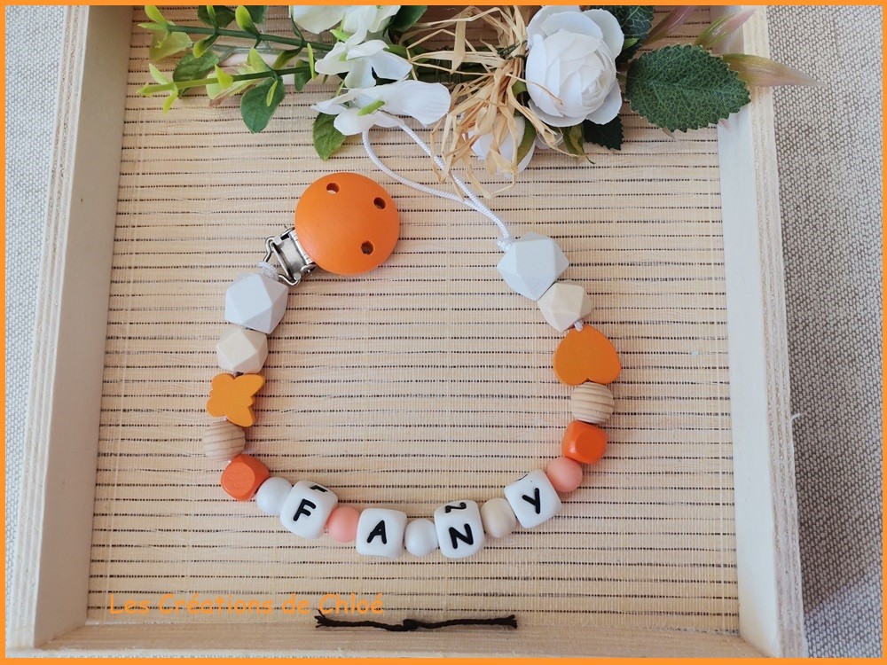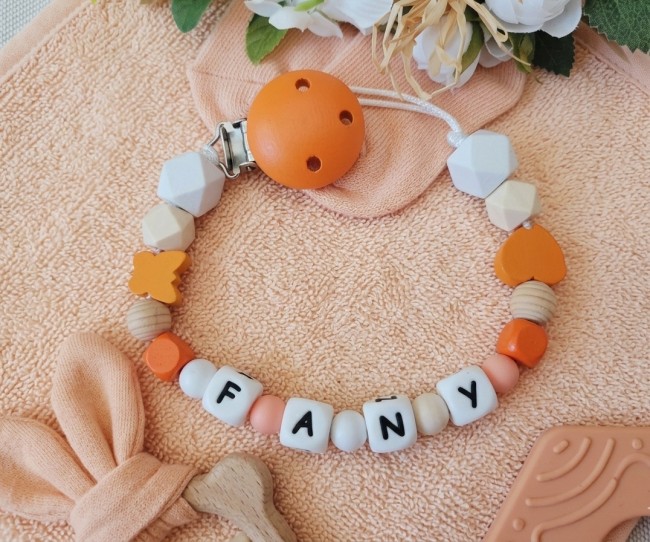 Cette attache tétine personnalisée est fabriquée avec des perles en bois de différentes tailles, formes et couleurs, et des perles alphabet en silicone.
