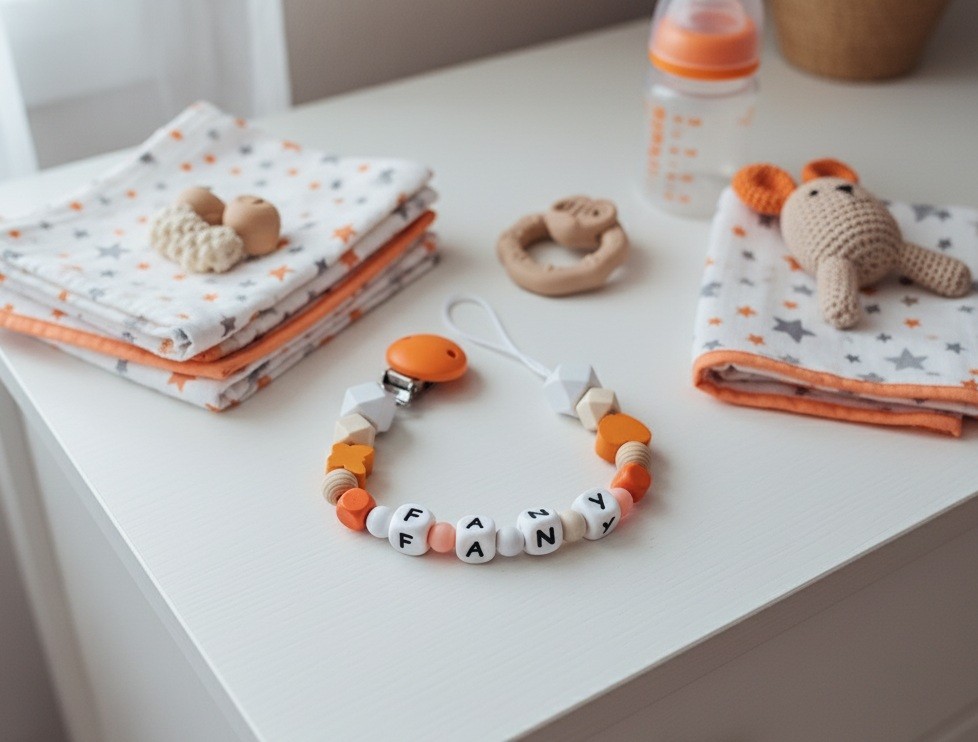 Longueur environ 26 cm. S'adapte sur les tétines avec anneau. Maximum 7 lettres, uniquement lettres majuscules sans accents.