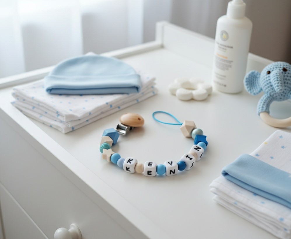 Longueur environ 26 cm. S'adapte sur les tétines avec anneau. Maximum 7 lettres, uniquement lettres majuscules sans accents.