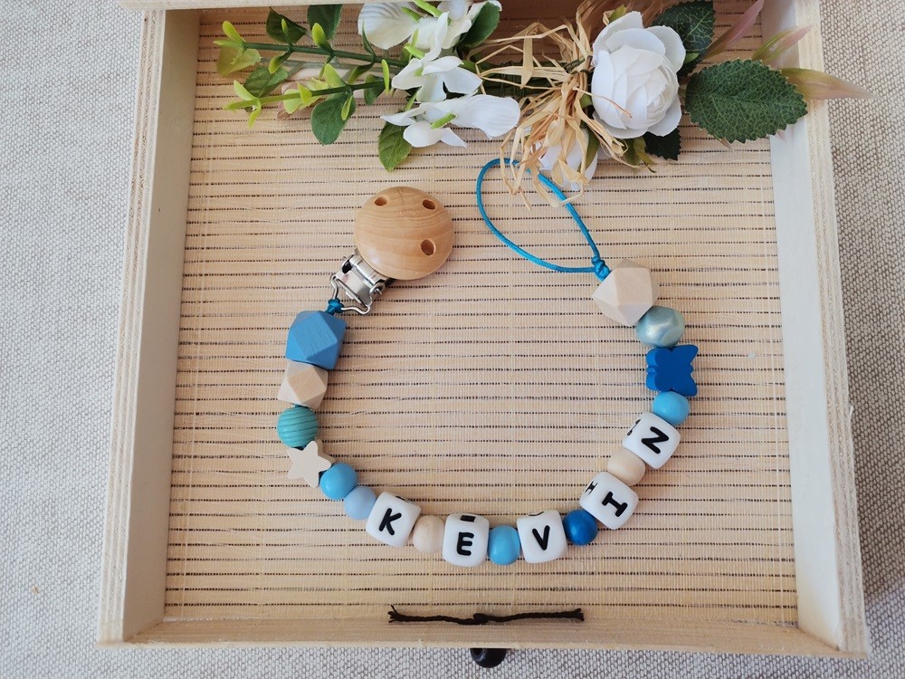 Cette attache tétine personnalisée est fabriquée avec des perles en bois de différentes tailles, formes et couleurs, et des perles alphabet en silicone.