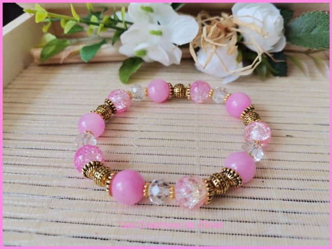 Bracelet sur fil élastique avec perles en verre laqué et jade de couleur saumon et apprêts de couleur doré