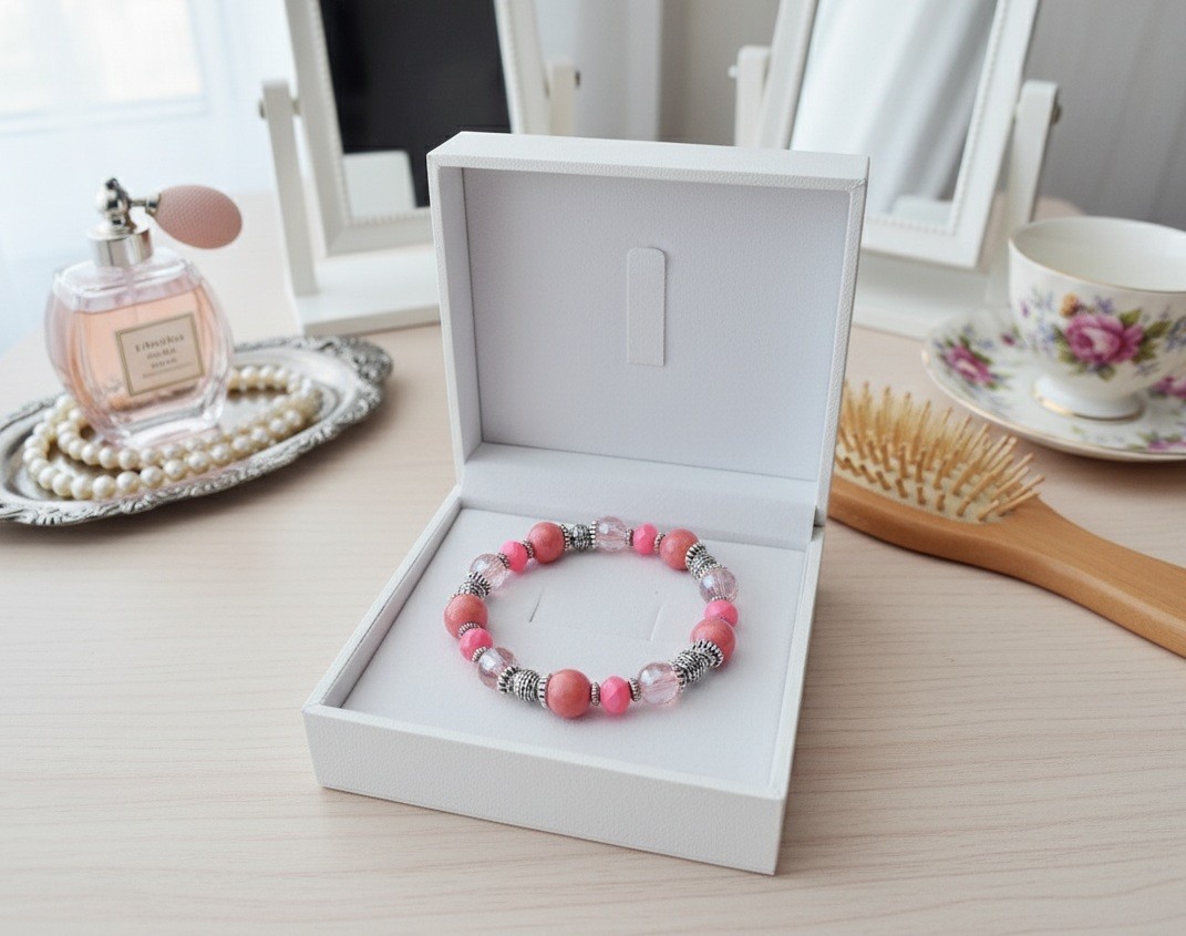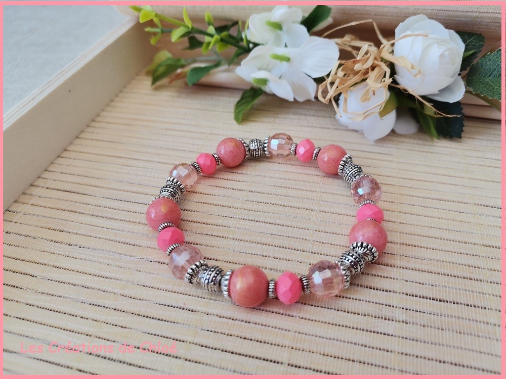 Bracelet sur fil élastique avec perles en verre laqué et jade de couleur saumon et apprêts de couleur argent mat