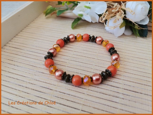 Bracelet sur fil élastique avec perles en verre de 8 mm de couleur orange avec apprêts de couleur bronze