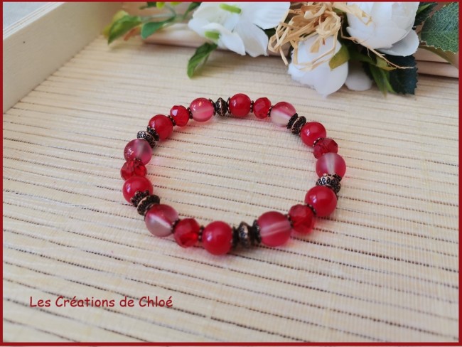 Bracelet sur fil élastique avec perles en verre de 8 mm de couleur rouge avec apprêts de couleur cuivre rouge