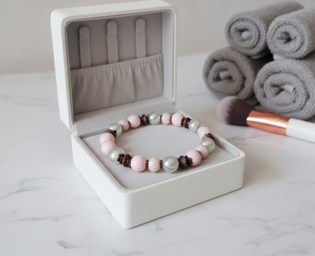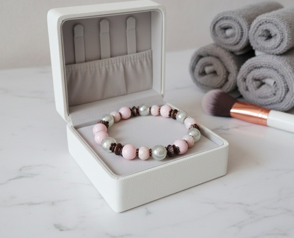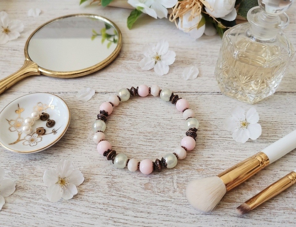 Bracelet sur fil élastique avec perles en verre de 8 mm de couleur beige et rose avec apprêts de couleur cuivre rouge