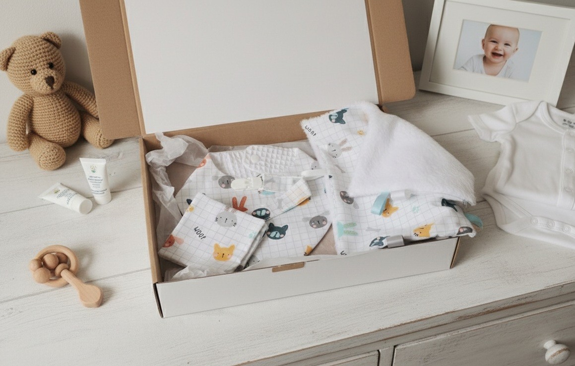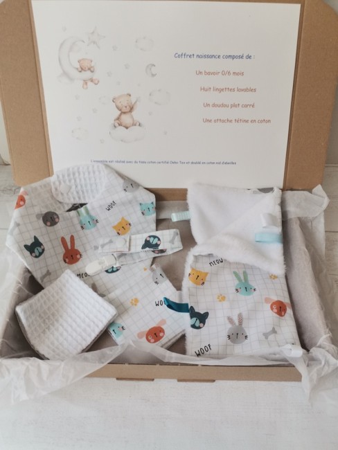 Coffret naissance idéal pour les premiers repas de bébé avec un bavoir, une attache tétine en tissu, un doudou (doublé tissu doudou) et 8 lingettes assorties