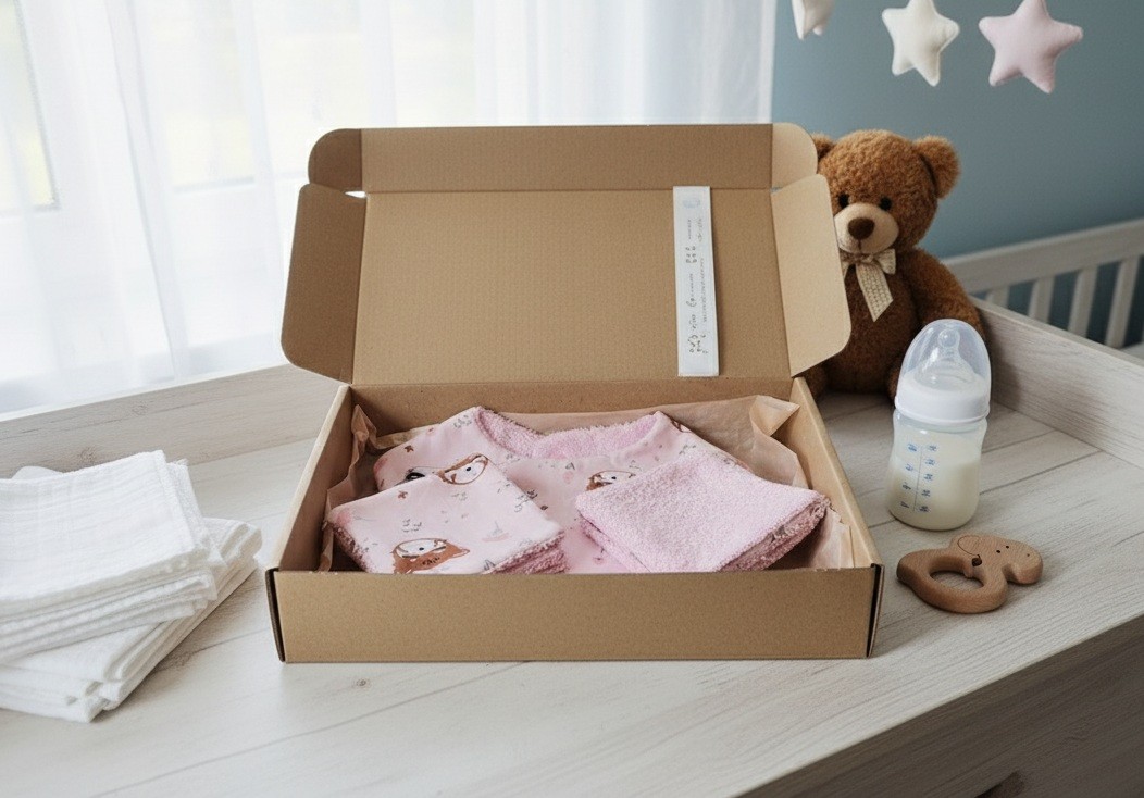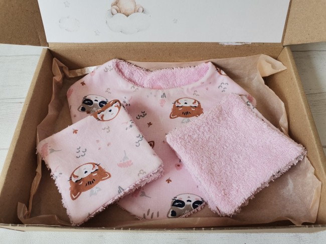 Coffret naissance idéal pour les premiers repas de bébé avec un bavoir et 10 lingettes assorties