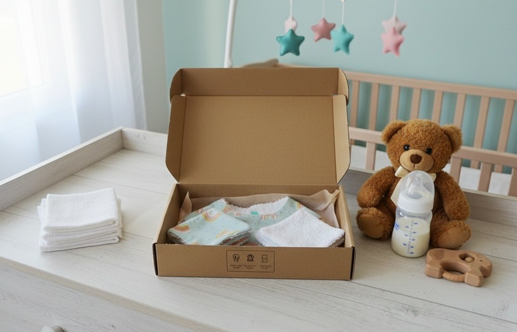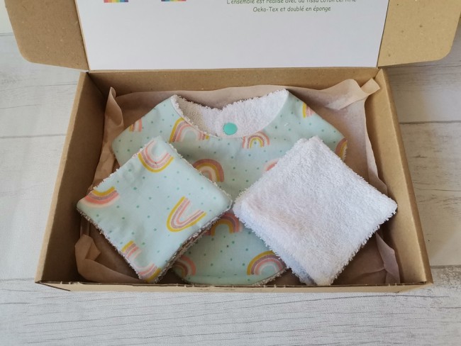 Coffret/box naissance idéal pour les premiers repas de bébé avec un bavoir et 10 lingettes assorties