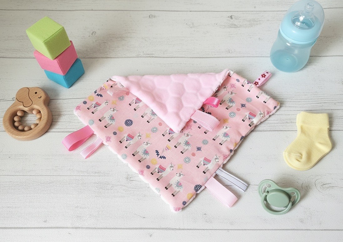 Doudou carré étiquettes parfait pour l'éveil de bébé .