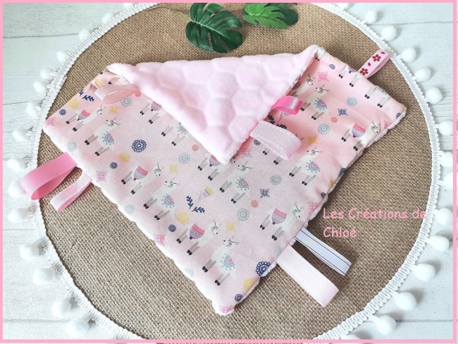 Un coté tout doux en tissu minky de couleur rose ,l'autre face en coton certifié Oeko-Tex imprimé ,