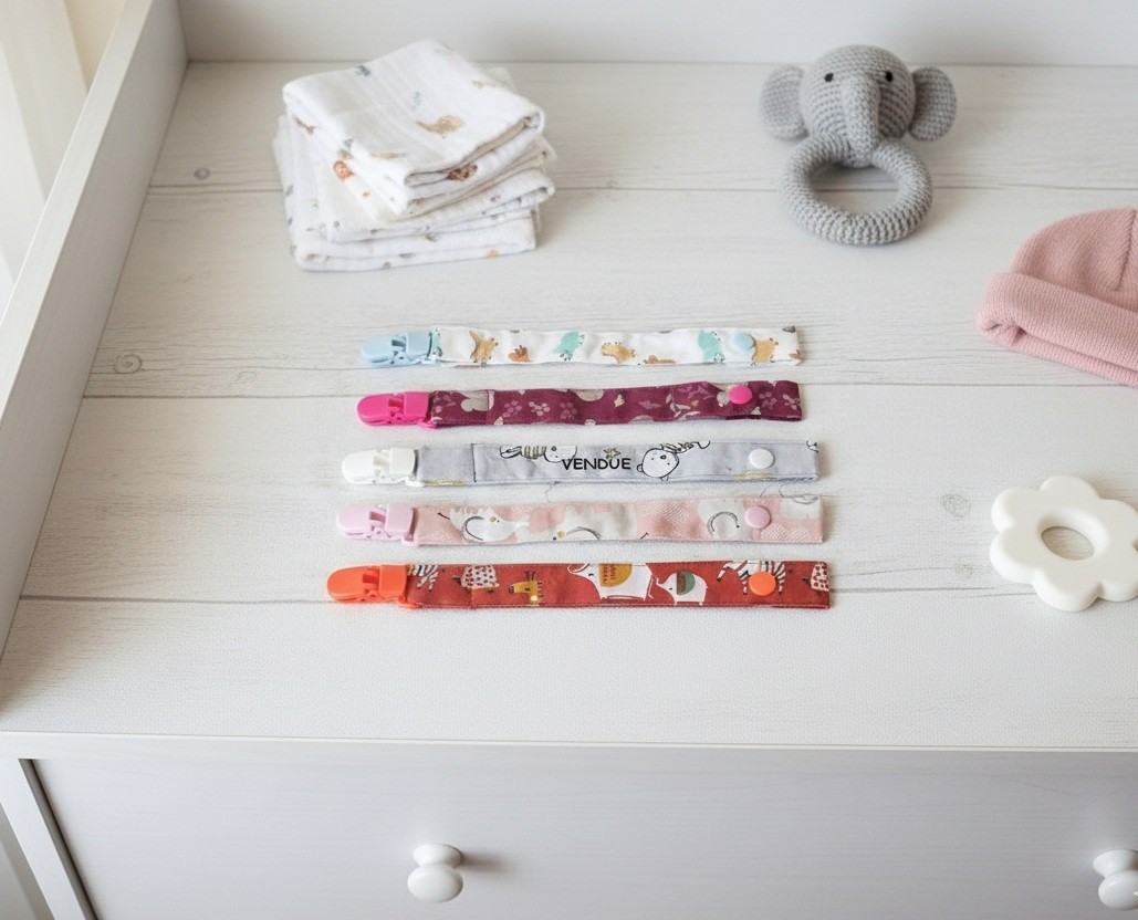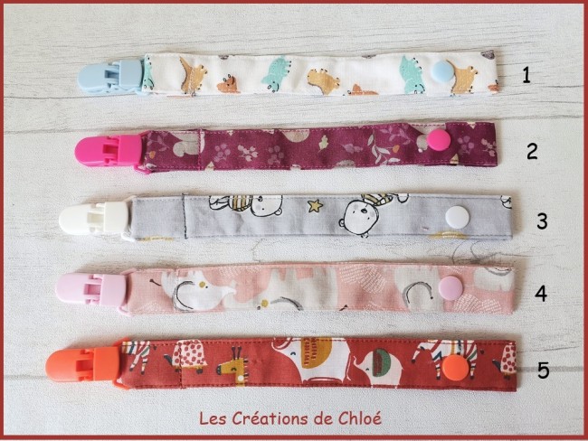 Attache tétine en tissus coton certifié Oeko-Tex imprimé avec pince couleur et bouton pression