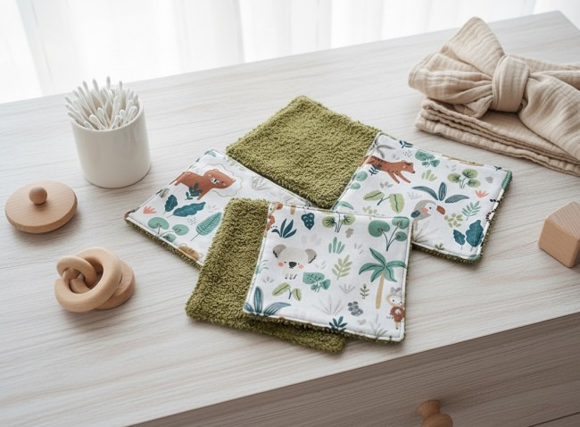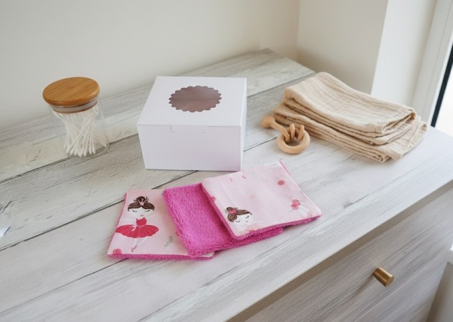 Un peu de douceur pour le change de bébé avec ce lot de 8 lingettes lavables dans leur boite cadeau
