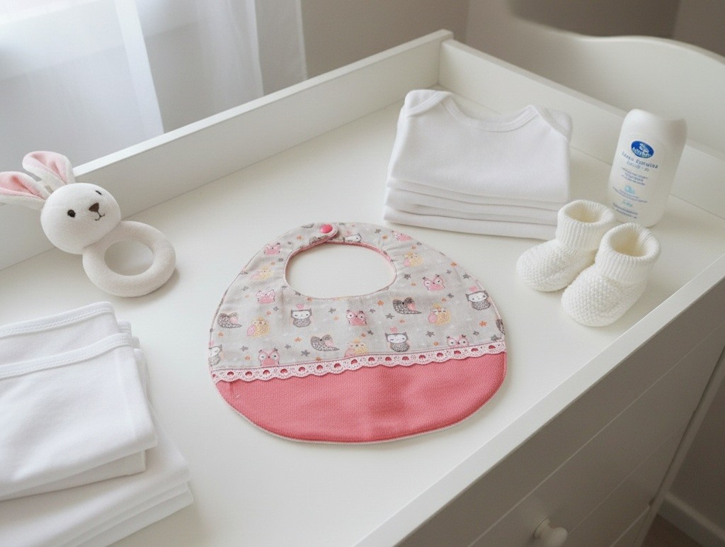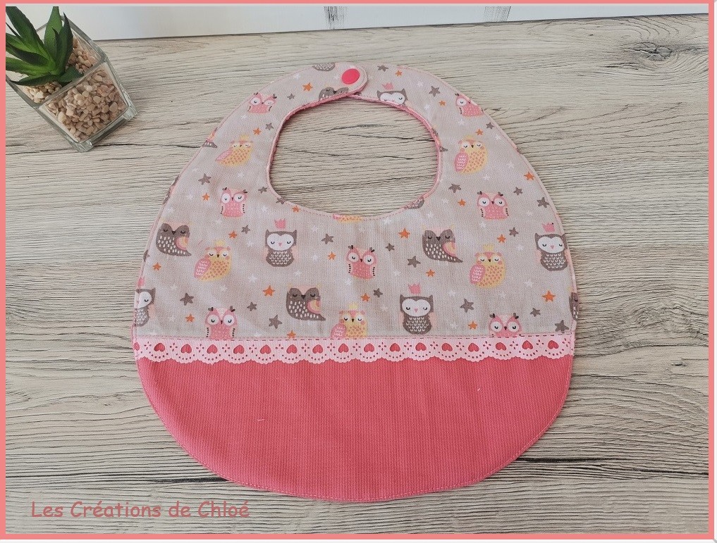 Tissu à motif chouettes et tissu coton peigné saumon séparé par un joli ruban dentelle motifs coeurs roses et doublé par un tissu absorbant 100% coton nid d'abeilles de couleur saumon