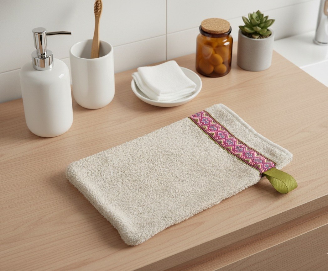 Gant de toilette en éponge de couleur beige avec un ruban motifs multicolores et une petite dragonne