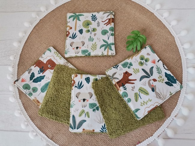 Une face coton certifié Oeko-Tex motifs animaux et l'autre face en éponge de couleur kaki