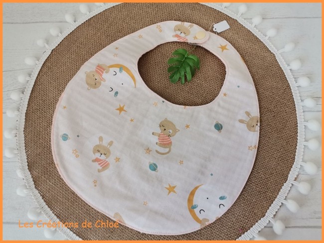 Ce joli bavoir se ferme par un bouton pression en résine de couleur beige