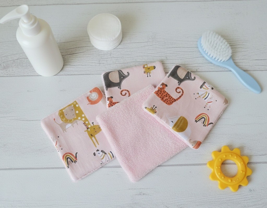 Une face coton certifié Oeko-Tex motifs animaux et l'autre face en tissu éponge bambou de couleur rose