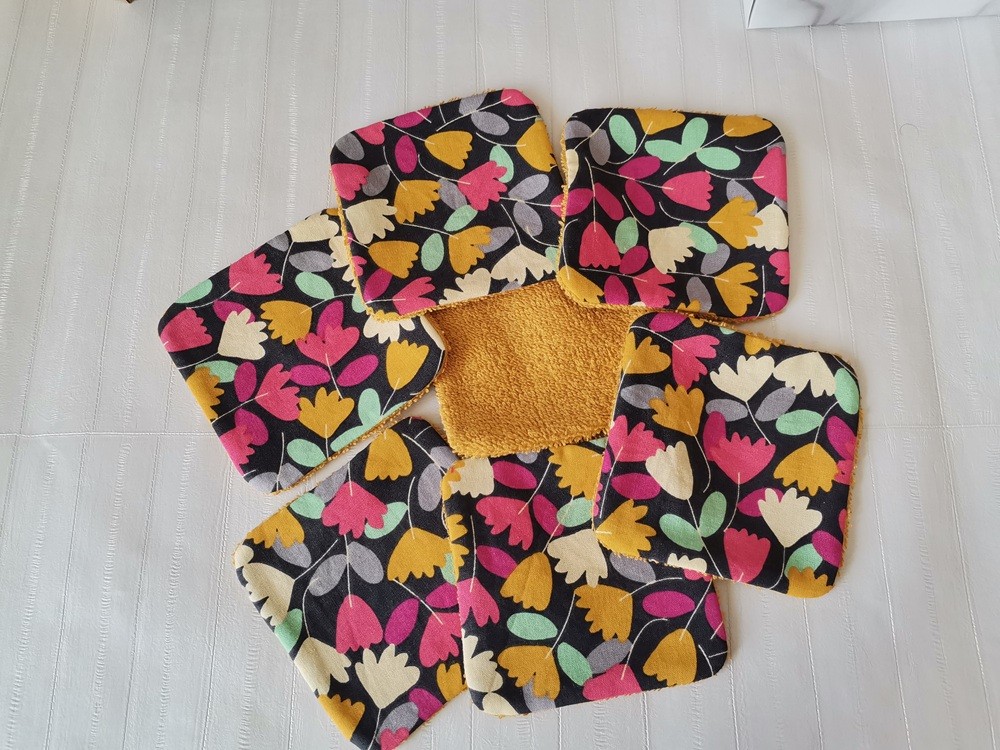 Une face coton imprimé Oeko-Tex et une face tissus éponge de couleur moutarde