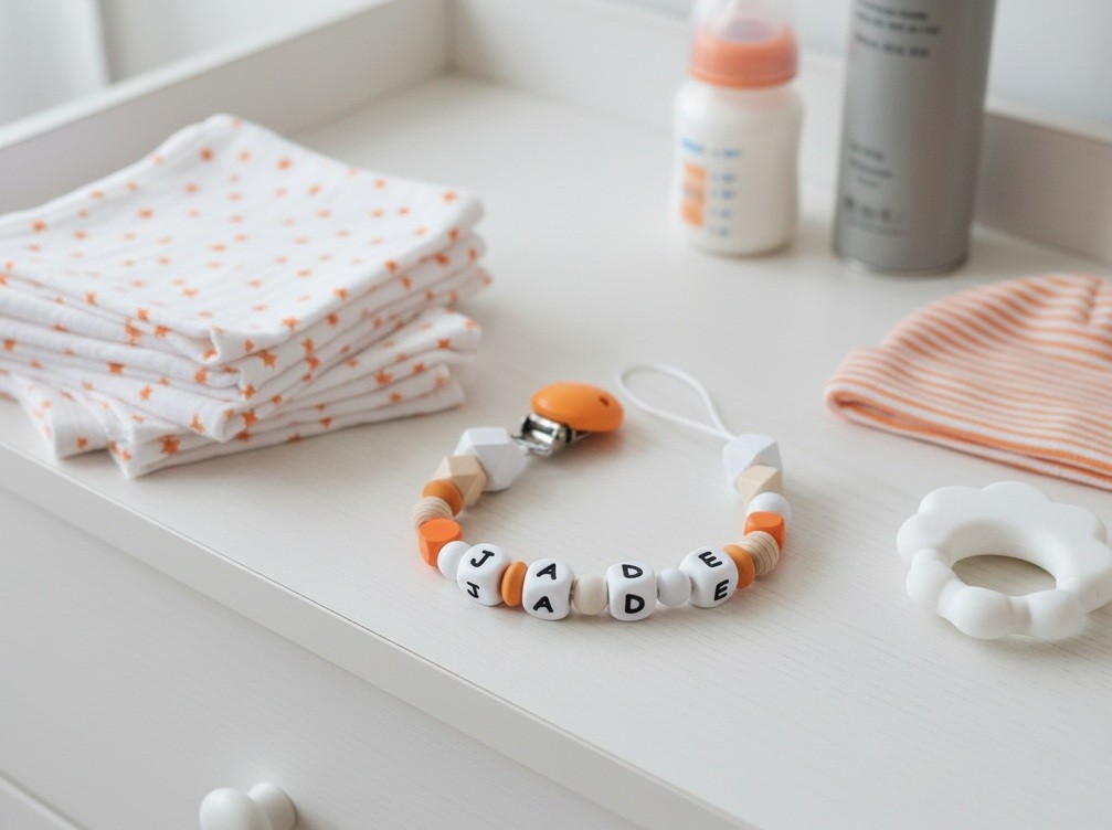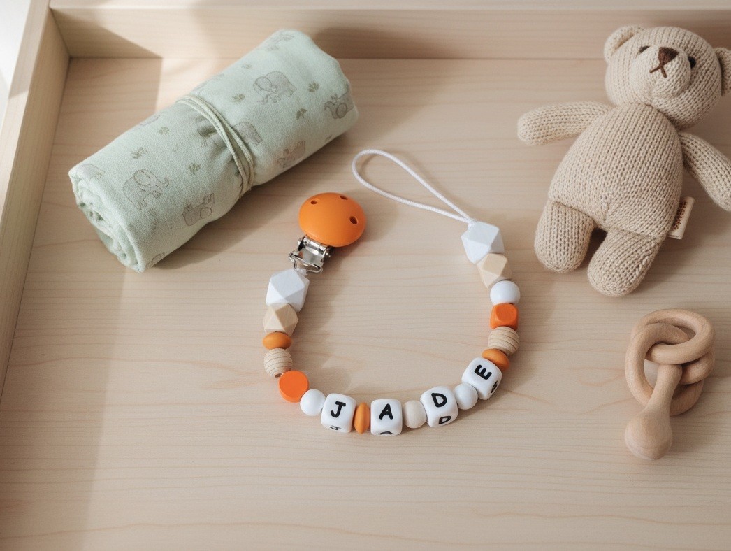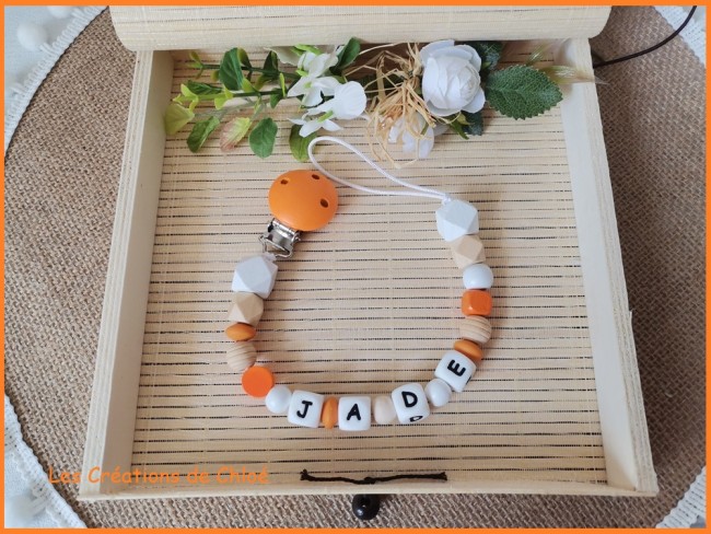 Attache tétine personnalisée perles bois silicone blanc/orange