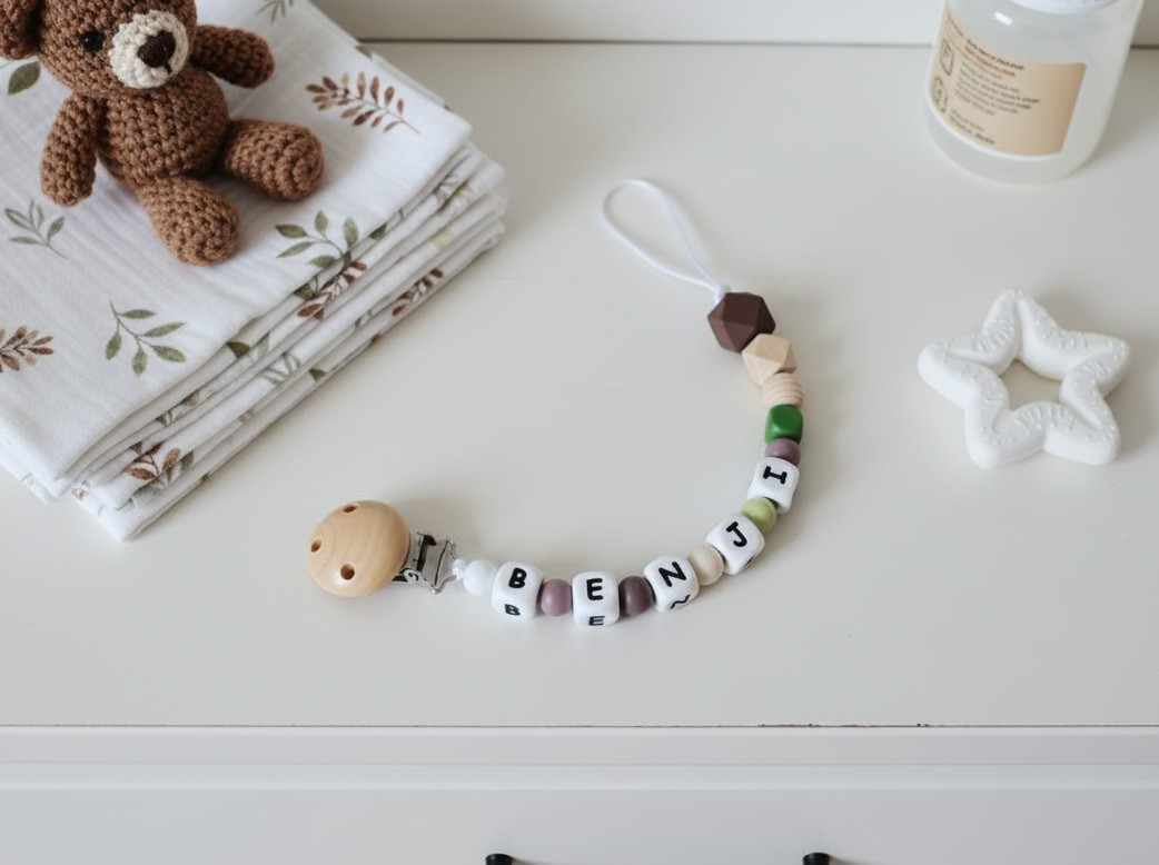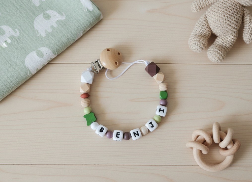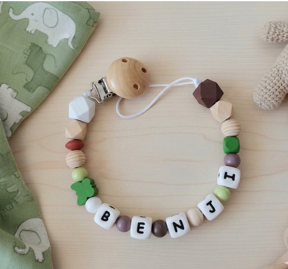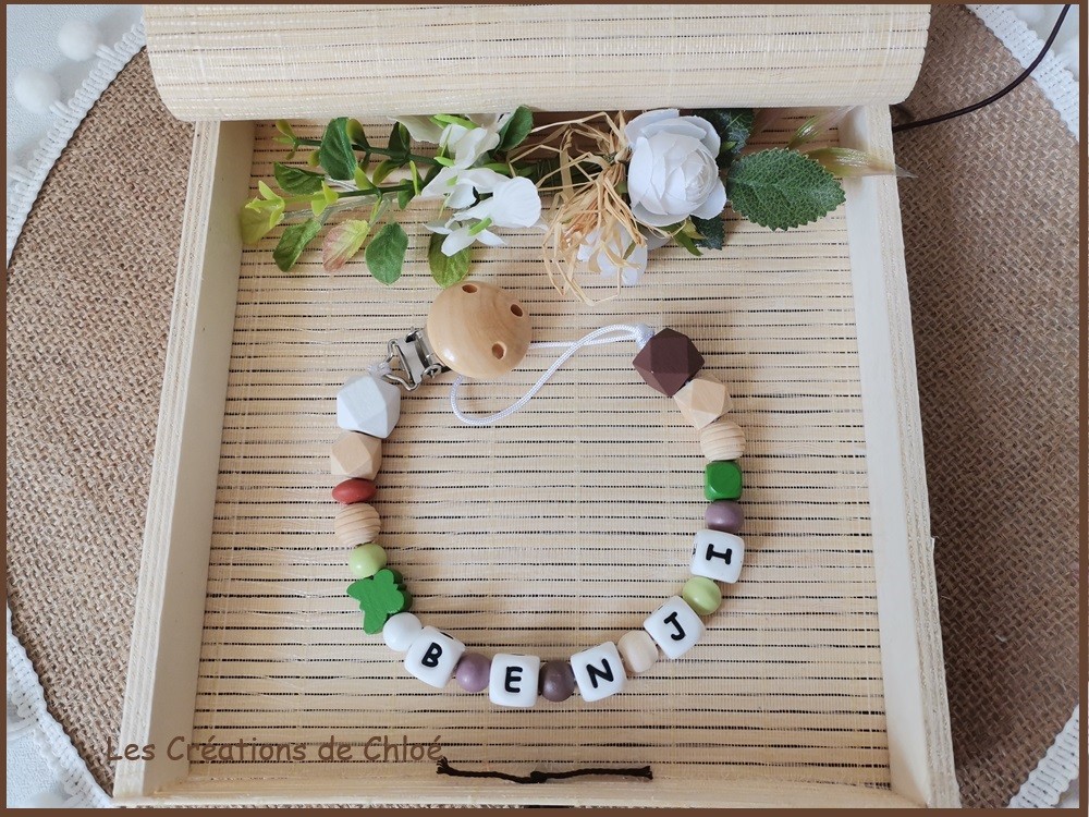 Attache tétine personnalisée perles bois silicone marron/vert/blanc/bois