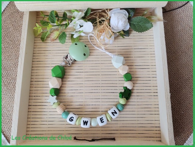 Attache tétine personnalisée perles bois silicone vert/blanc/bois