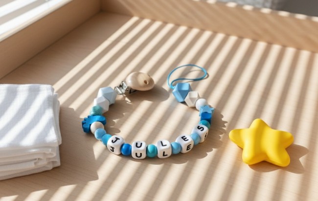 Longueur environ 26 cm. S'adapte sur les tétines avec anneau. Maximum 7 lettres, uniquement lettres majuscules sans accents.